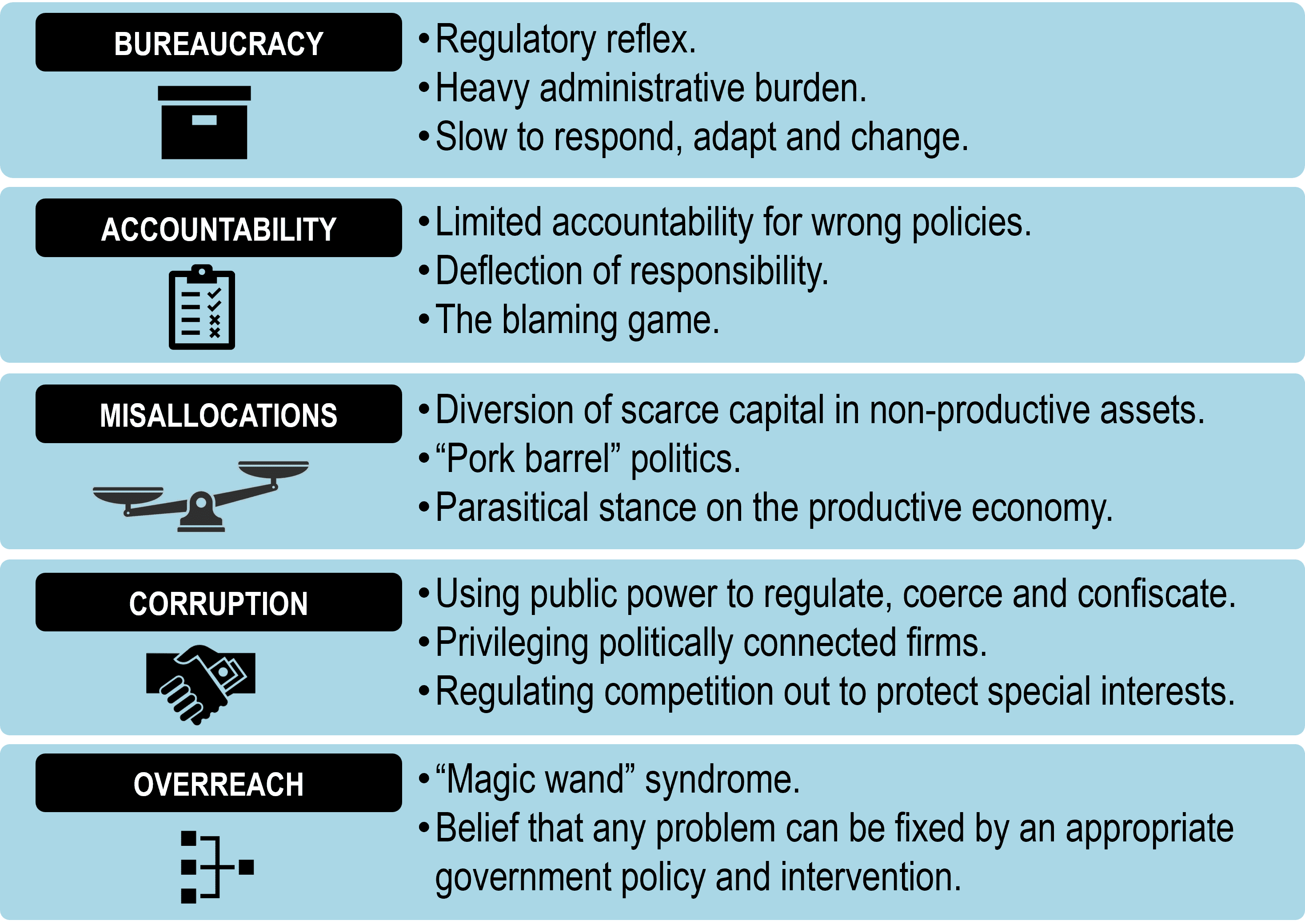 Price and capital controls, central planning, inflationary monopoly money, tariffs, trade barriers, import-export quotas, bailouts, and subsidies for failing businesses.