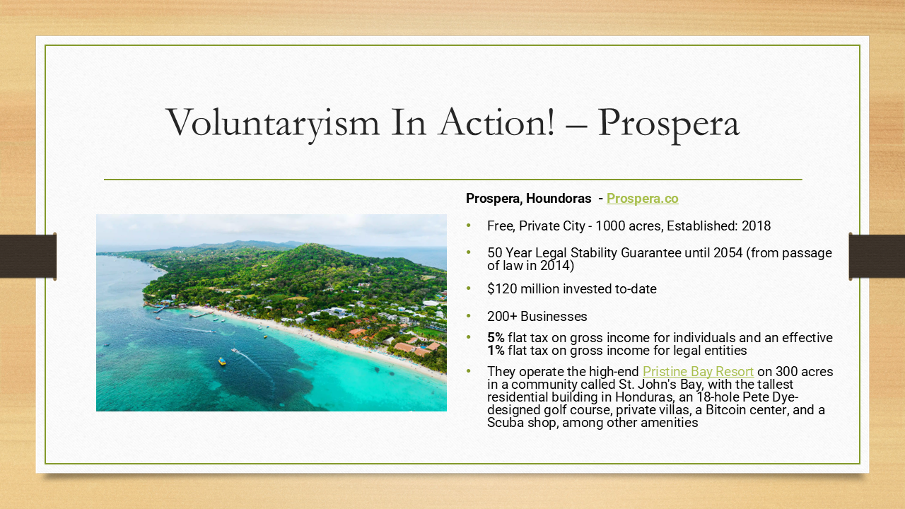 This is Prospera in Honduras. It’s a free private city. It’s located on the island of Roatán off the coast of Honduras. It’s in something called a special economic zone. They negotiated sovereignty with the government of Honduras, where the laws of Honduras do not apply to Prospera. And so, it’s a private city where they’re providing some of the strongest private property protections in the world. They have some of the strongest economic freedom in the world. There’s been over $120 million invested to date. This is an old number, it’s probably greater than that. There are 200-plus businesses that have relocated there or incorporated there. They have a 5% flat tax on gross income for individuals and an effective 1% flat tax on gross income for legal entities and businesses. They operate the Pristine Bay Resort in St. John’s Bay. They have the tallest residential building in Honduras. They have an 18-hole Pete Dye-designed golf course, private villas, a Bitcoin center, and a scuba shop. They’re doing it all without extortion. You decide if you want to live there, if you want to be under their laws. If you don’t like it, you can go somewhere else.