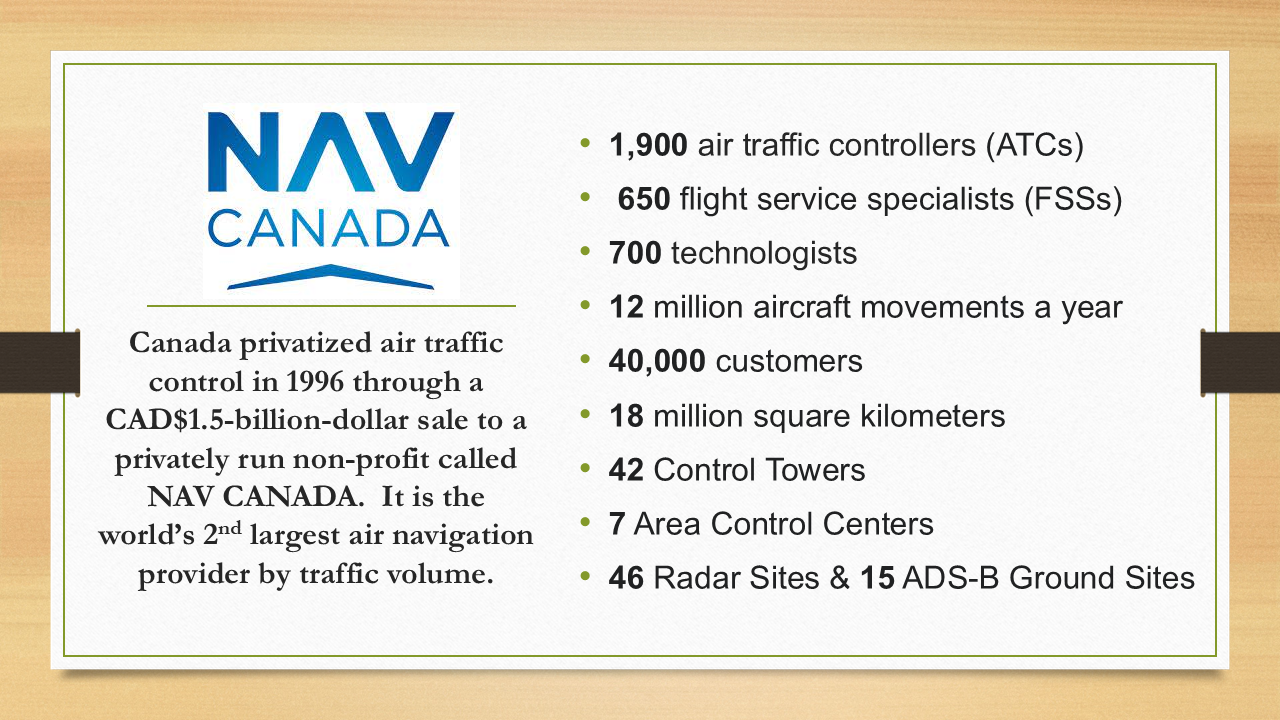 So, a lot of people don’t know this, but Canada privatized their air traffic control in 1996. The private company is called NAV CANADA. They have 1,900 air traffic controllers, 650 flight service specialists, 700 technologists, computer programmers, and IT folks. They manage 12 million aircraft movements a year. They have 40,000 customers—private pilots, airlines, and others. They’re covering 18 million square kilometers. They have 42 control towers. They have seven area control centers. They have 46 radar sites, 15 ADS ground sites. It’s the second-largest air navigation provider by volume in the world.