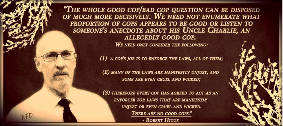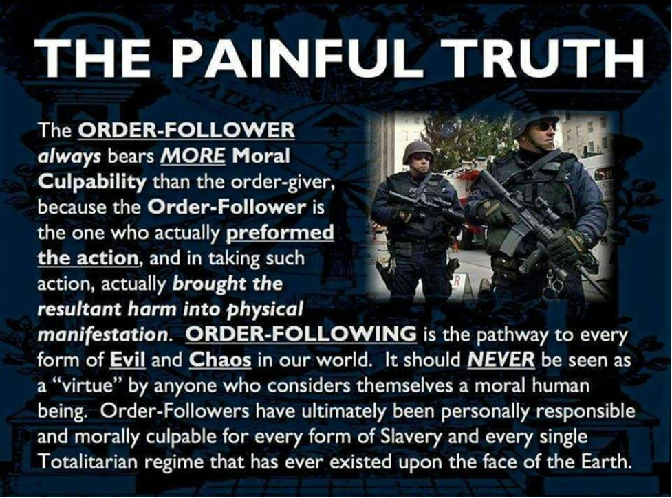 I concluded that very few sheriffs, police chiefs, deputies and officers understand basic morality. Essentially, the police are “order-followers” who check their morality at the door and take the job knowing they will have to enforce all the laws… even though many are manifestly unjust, cruel and wicked… I.E., they are volunteering to use violence on peaceful people for politicians… The uniform and the badge are a sign that they are amoral.
