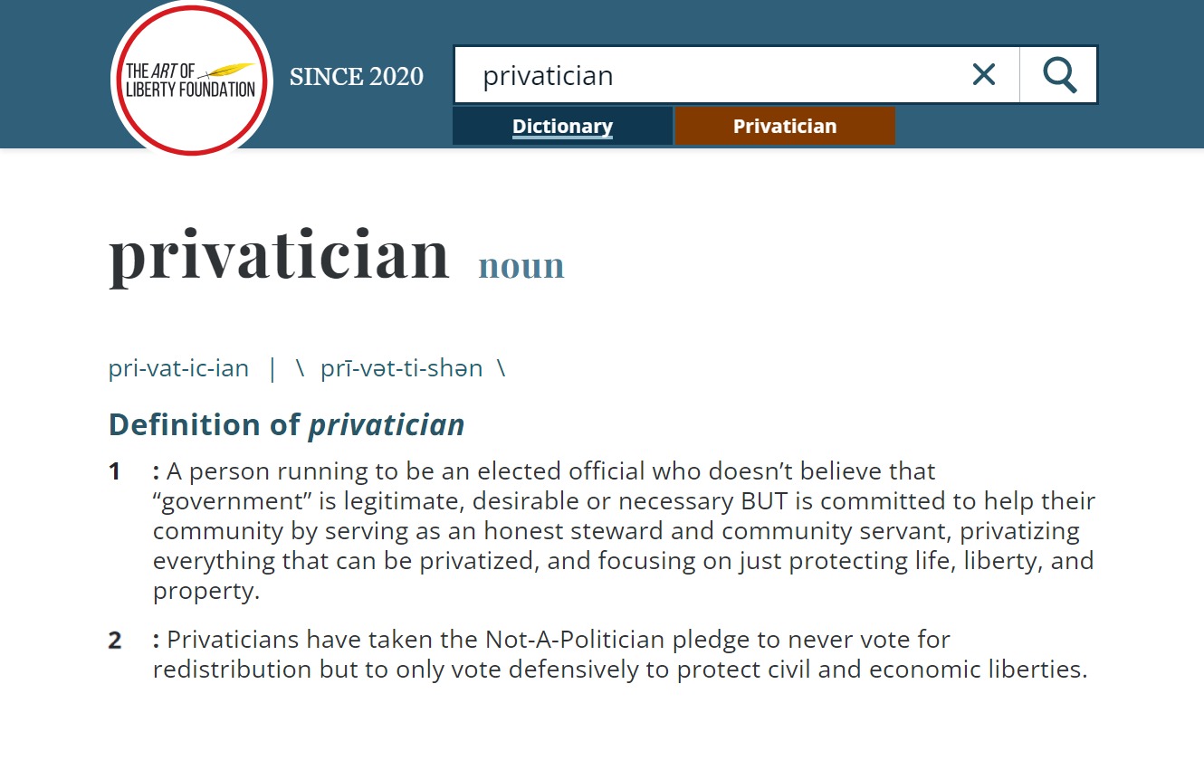 To get there, we don’t need Politicians like Scott Jablow; we need Privaticians who understand that “government” is an illogical and immoral scam and are only running to serve as honest stewards and community servants by privatizing everything that can be privatized and ONLY protecting life, liberty and property.