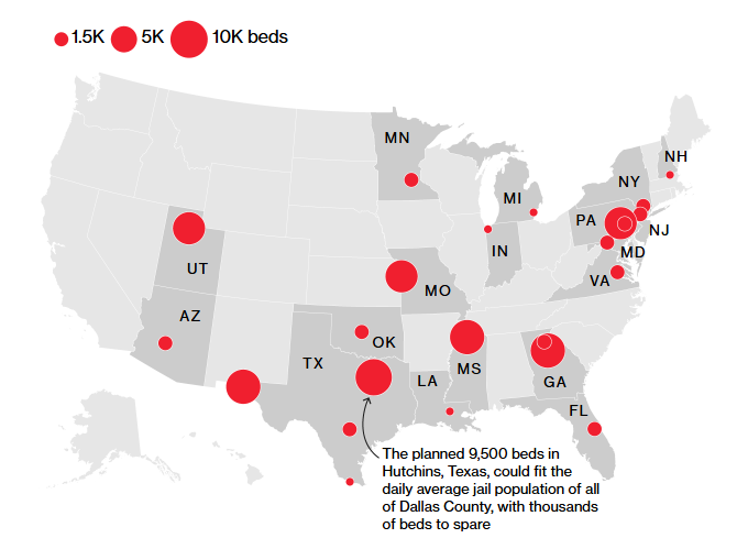 The 23 proposed sites would range in size from 500 to 9,500 beds. If completed as planned, the larger facilities would be some of the biggest detention centers of any kind in the country. For example, the 9,500-bed facility ICE is planning for Hutchins, Texas, could fit the entire average daily jail population of Dallas County with thousands of beds to spare.