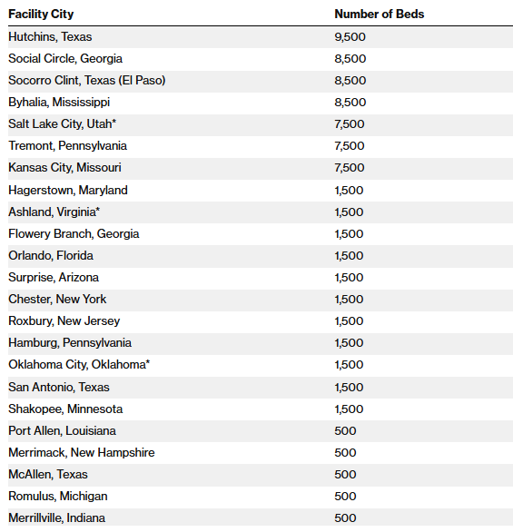 Note: * Owners of the facilities ICE identified in these cities say they have no plans to sell to the agency. This list is based on ICE’s plans and may change. Some of the cities are approximate locations, based on nearest municipality.