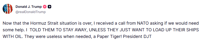 “Now that the Hormuz Strait situation is over, I received a call from NATO asking if we would need some help,” the president wrote.