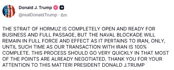 This time, he says the US blockade of Iranian ships and ports will “remain in full force”, despite Iran’s announcement that the Strait of Hormuz is reopening to shipping.