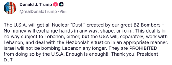 Trump posted his NATO comments after yet another statement on his Truth Social platform, in which Trump declared Israel is “prohibited” from bombing Lebanon.