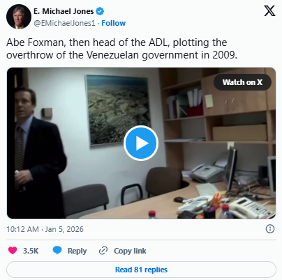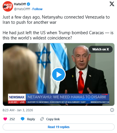 Various commentators point out Israel’s link to the capture of Maduro from Venezuela. Zionist Billionaire Paul Singer bought Citgo and stands to make large profits from Venezuela’s oil supply. Max Blumenthal revealed that it will take years to rebuild Venezuela’s oil infrastructure. Exxon Mobil seeks to restore control over its oil fields. Elon Musk published fake AI videos of Venezuelans celebrating because Musk wants access to Venezuela’s lithium and other minerals.
