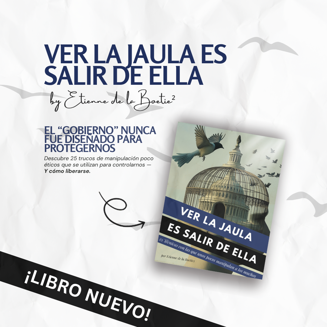 Pásate al nivel de pago de $5 al mes y te enviaremos las versiones en PDF y e-Pub de AMBAS ediciones, la de España y la de Latinoamérica, del nuevo libro de Etienne de la Boetie: Ver la jaula es salir de ella: 25 técnicas con las que unos pocos manipulan a los muchos y un código de cupón del 10% de descuento para cualquier artículo en https://artofliberty.org/store/.