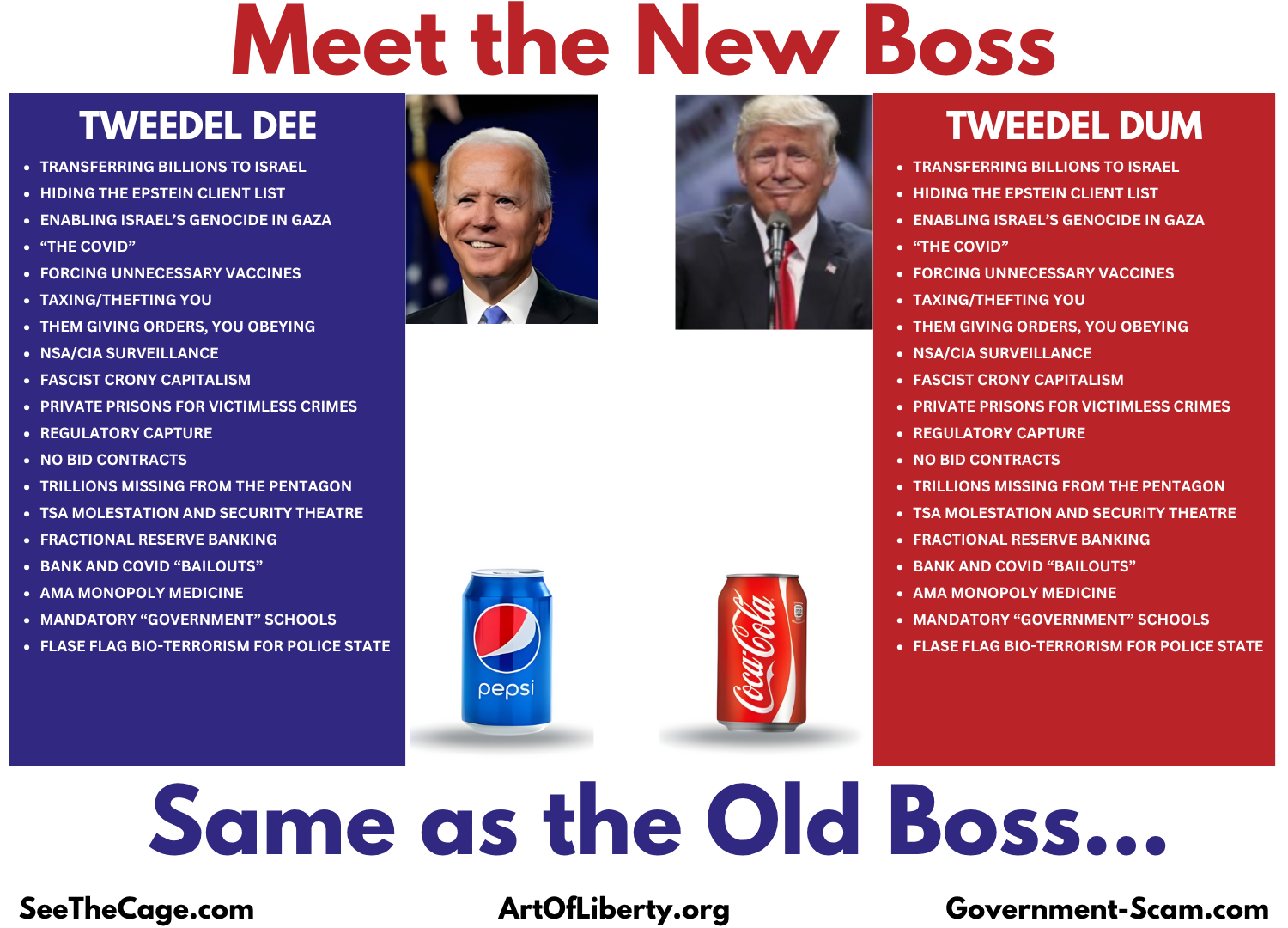 This organized crime system has been using the exact same techniques used by disingenuous religions and cults to trick the population into a worldview where they are easily robbed, controlled, and trapped in a no-win game of rigged elections where the same interests secretly own both parties.