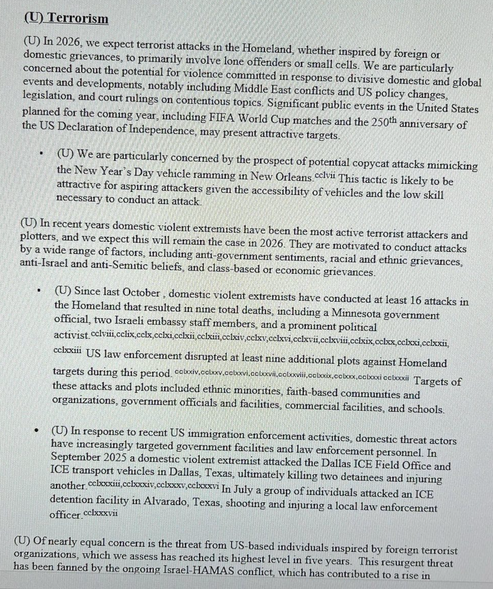 “In recent years domestic violent extremists have been the most active terrorist attackers and plotters, and we expect this will remain the case in 2026,” the assessment says.