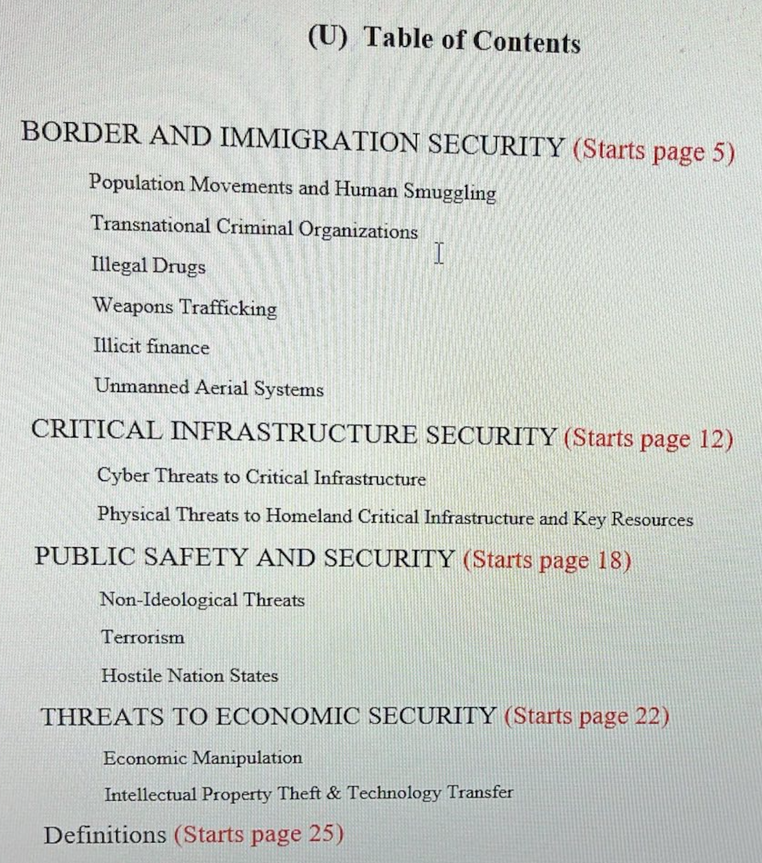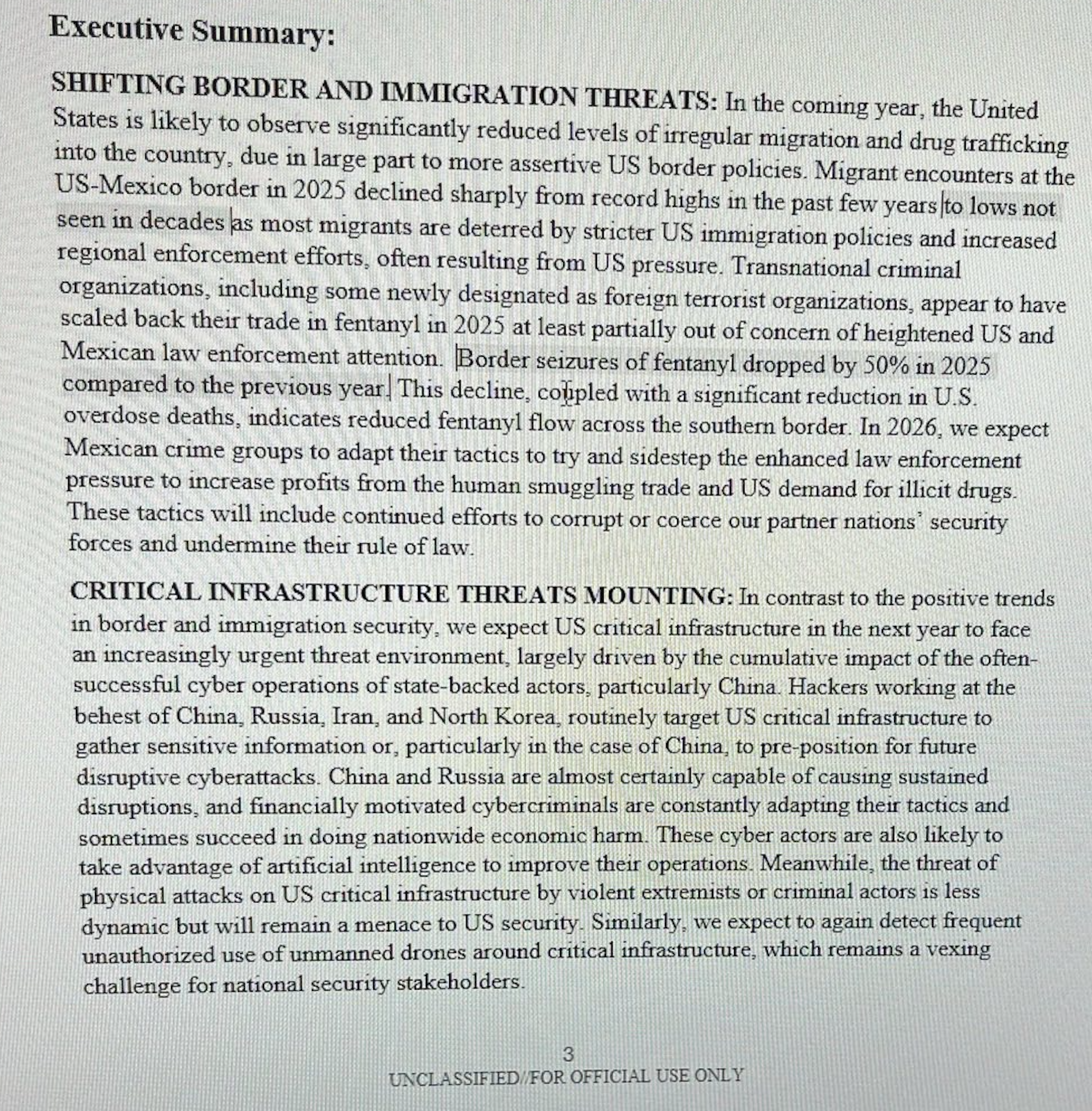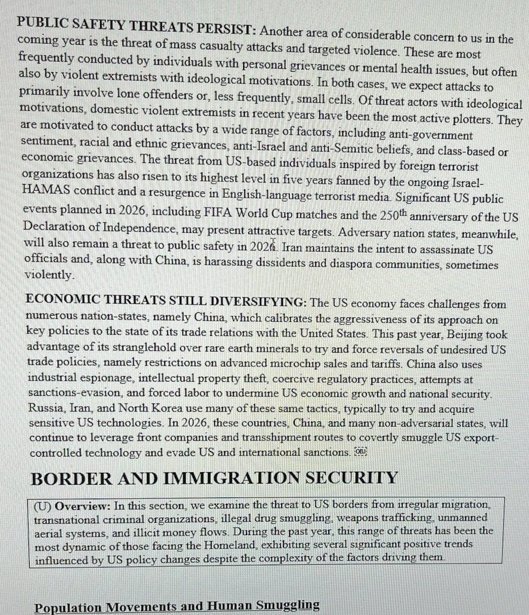 The assessment does mention the ongoing aggressive actions against alleged drug boats, Venezuelan tankers and the usual kitchen sink list of perennial threats — gangs, human smuggling, weapons trafficking, transnational criminal organizations, small drones, money laundering, small drones, cyber threats, technology transfer, intellectual property theft, and on and on.