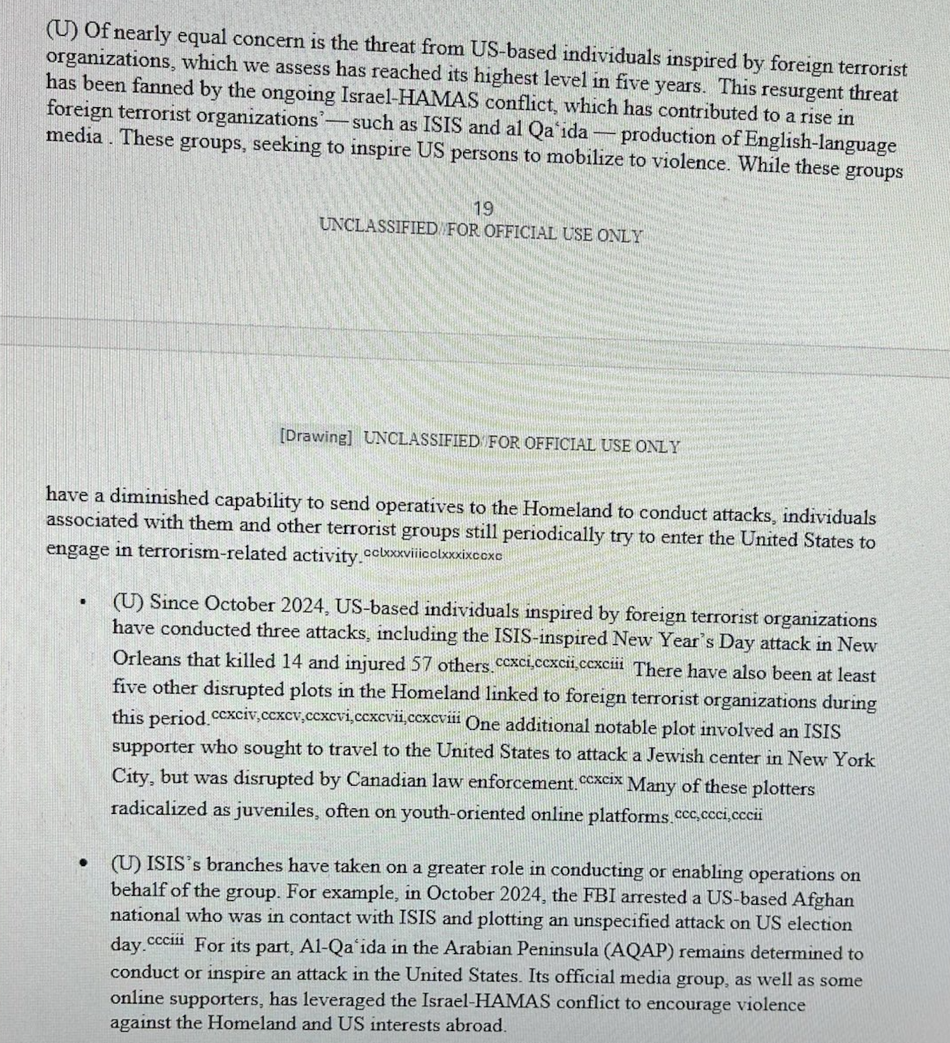 The latter section emphasizes the administration’s obsession with domestic terrorism, saying it has been and will remain the leading terrorist threat. Examples it cites include the assassinations of a Minnesota legislator, two Israel Embassy staffers in Washington, DC, as well as various attacks on ICE facilities and personnel.
