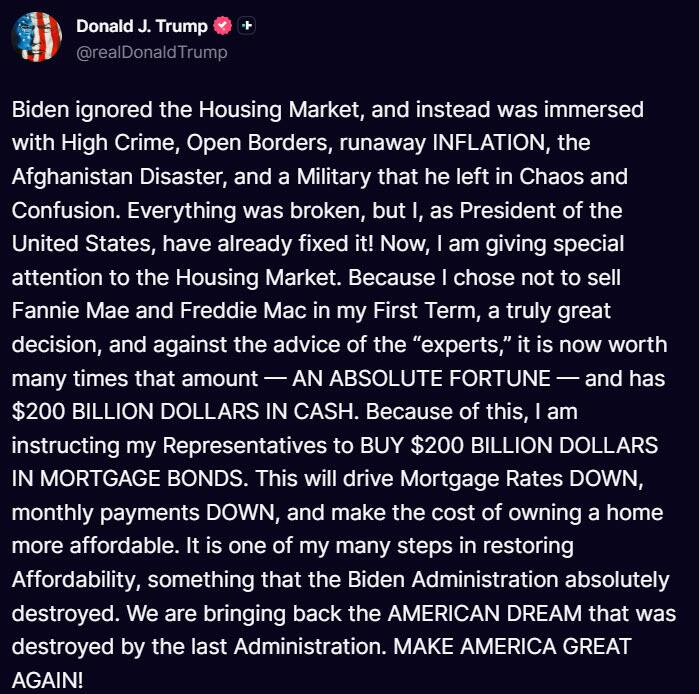 “This will drive Mortgage Rates DOWN, monthly payments DOWN, and make the cost of owning a home more affordable,” Trump wrote in his post.