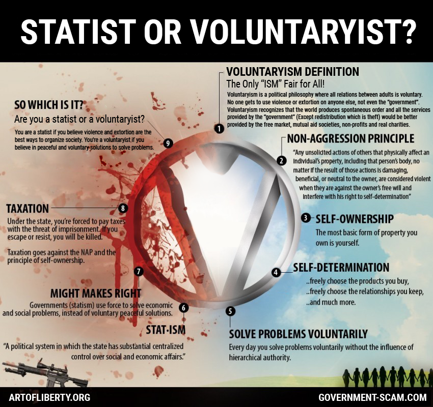 Voluntaryism—The free market, mutual aid societies, armed protective service companies, arbitration providers, insurance companies, and genuine charities would better provide all the legitimate services provided by monopoly “government.”