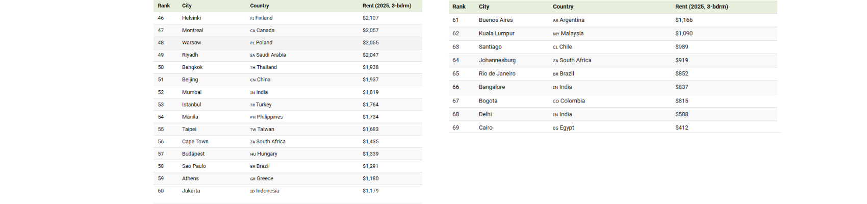 Cities in Latin America, South Asia, and parts of Africa remain far more affordable by comparison. Cairo, Delhi, Bogotá, and Bangalore all report monthly rents below $1,000.