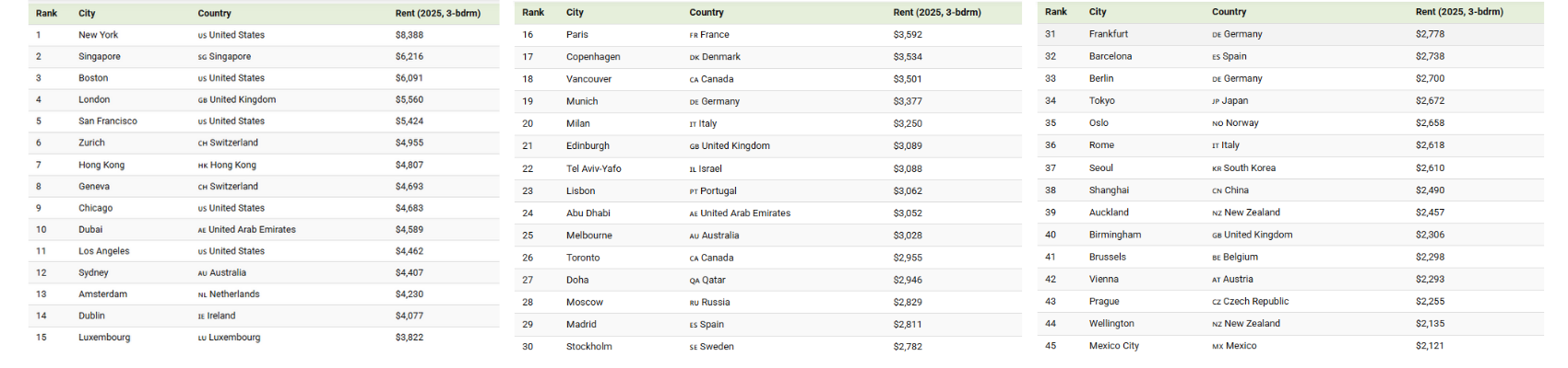 - New York is the most expensive city in the world for renting a three-bedroom apartment in the city center in 2025.