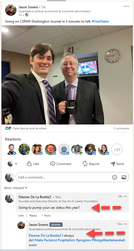 I am happy to debate either Jason Sorens (or Jeremy Kaufmann... or both) on the issue. I am assuming since Jason Sorens is pumping (Tobacco Science)#Data and (Tony Fauci) #Science then he will go for it. BTW, #WTF does #Capitalism have to do with mandatory government vaccines pushed by #RegulatoryCaptured agencies??? Finally, #thingslibertariansbelievein - The majority of libertarians I know are smart enough to avoid the organized crime government's "vaccines!"