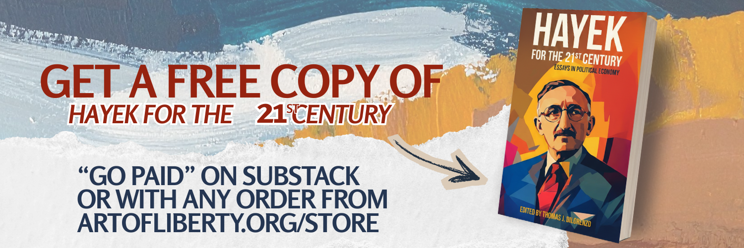 As part of the Art of Liberty Foundation’s Tribute to Nobel Laureate F.A. Hayek, in cooperation with the Mises Institute and the US Justice Charitable Foundation who provided free copies, the Art of Liberty Foundation is helping promote and distribute the book to anyone who “Goes Paid” as an annual member on Substack OR makes a purchase at ArtOfLiberty.org/Store.