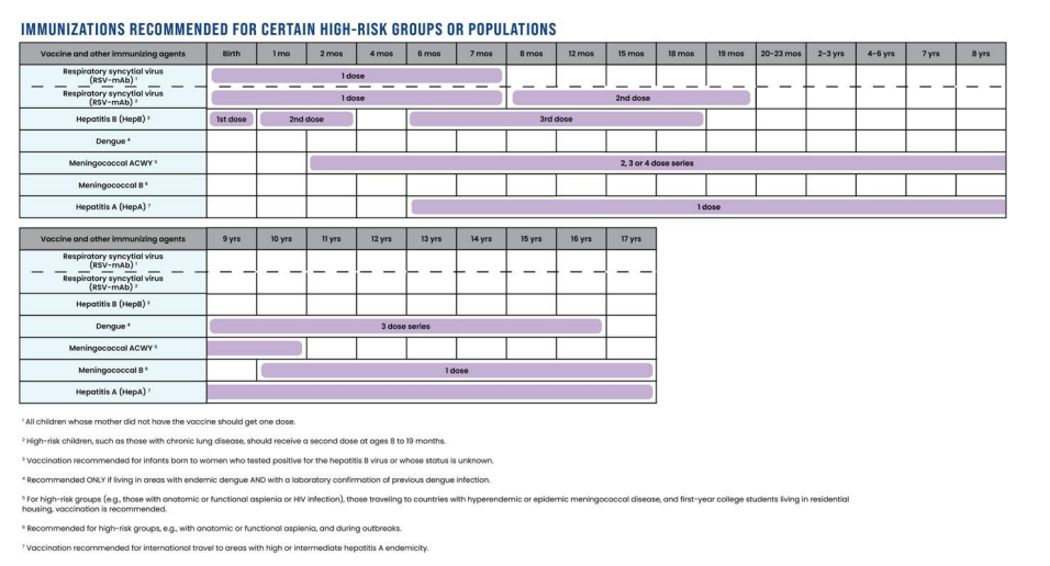 The immunizations recommended for certain high-risk groups or populations are for respiratory syncytial virus (RSV), hepatitis A, hepatitis B, dengue, meningococcal ACWY, and meningococcal B. Risk factors can include unusual exposure to the disease, underlying comorbidities, or the risk of disease transmission to others.