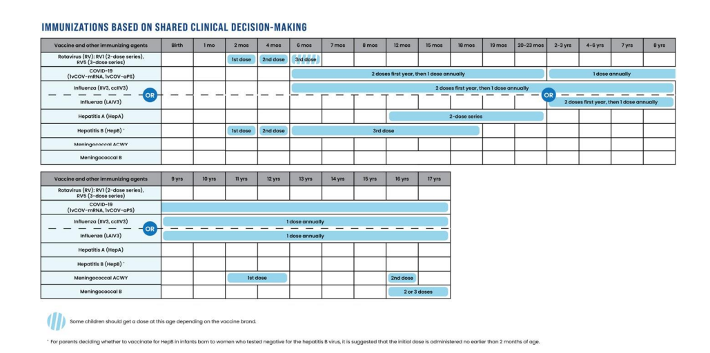 The immunizations based on shared clinical decision-making are for rotavirus, COVID-19, influenza, meningococcal disease, hepatitis A, and hepatitis B.