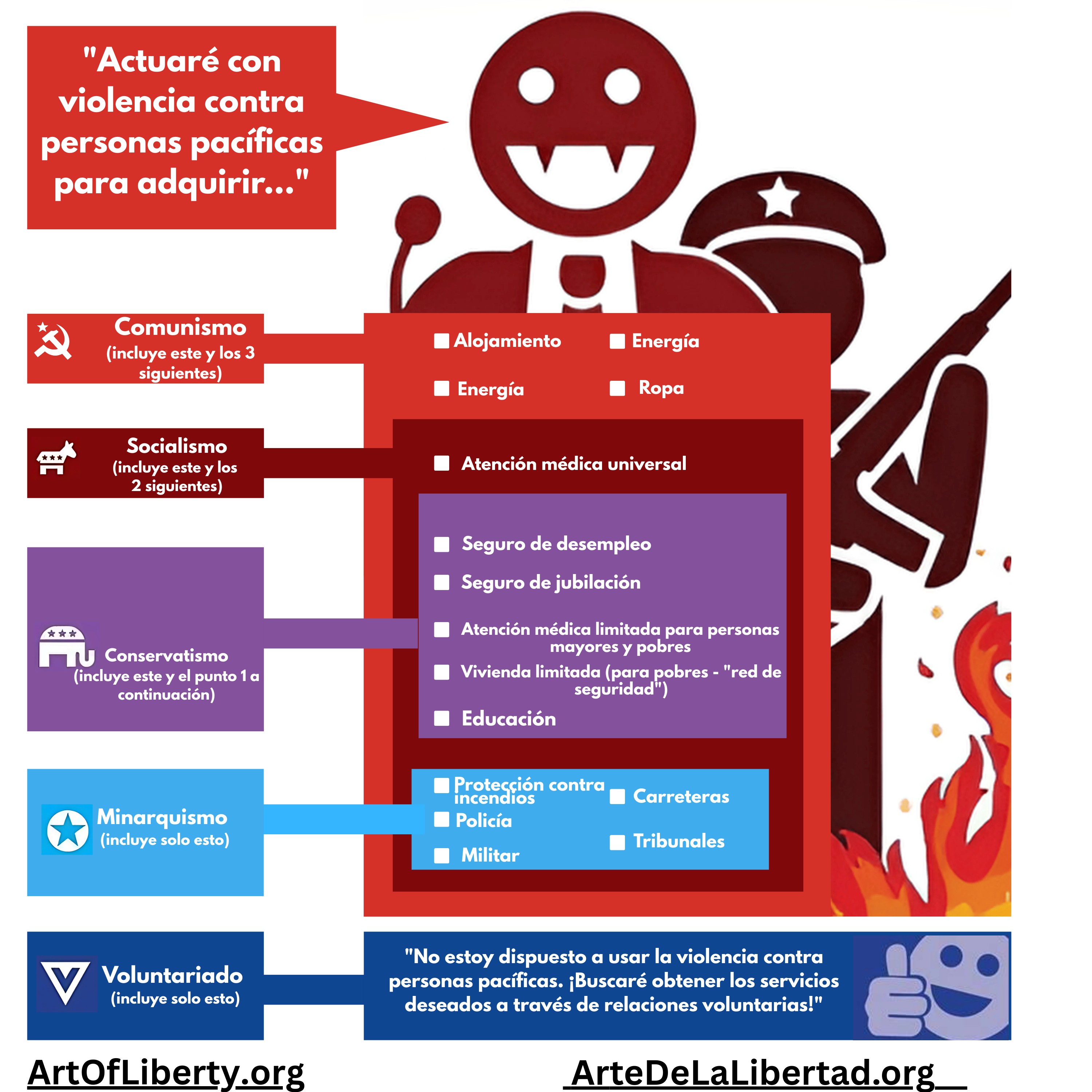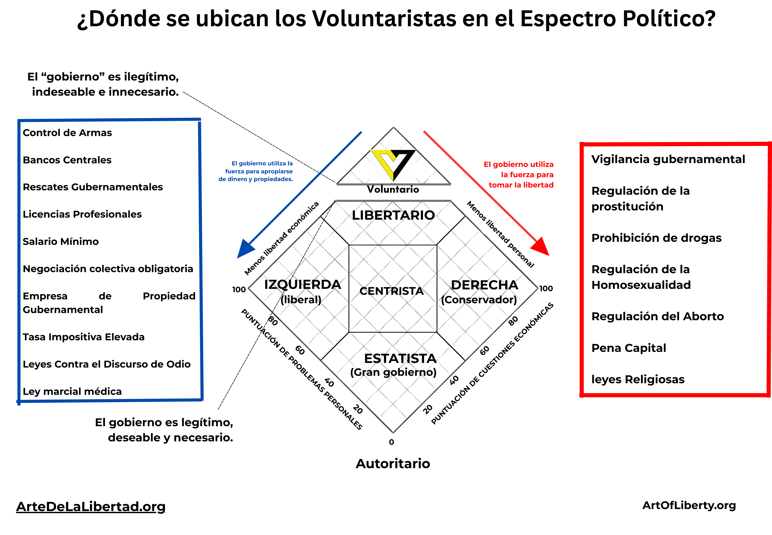 En mi versión, tengo una línea clara que define la diferencia entre un voluntarista y un libertario: ¿Crees que el “gobierno” es legítimo, deseable y necesario? Los voluntaristas dicen: ¡NO! Mientras que los libertarios estatistas, como los miembros del Partido Libertario, pueden encajar en el cuadrante libertario, pero no necesariamente en el voluntarista.