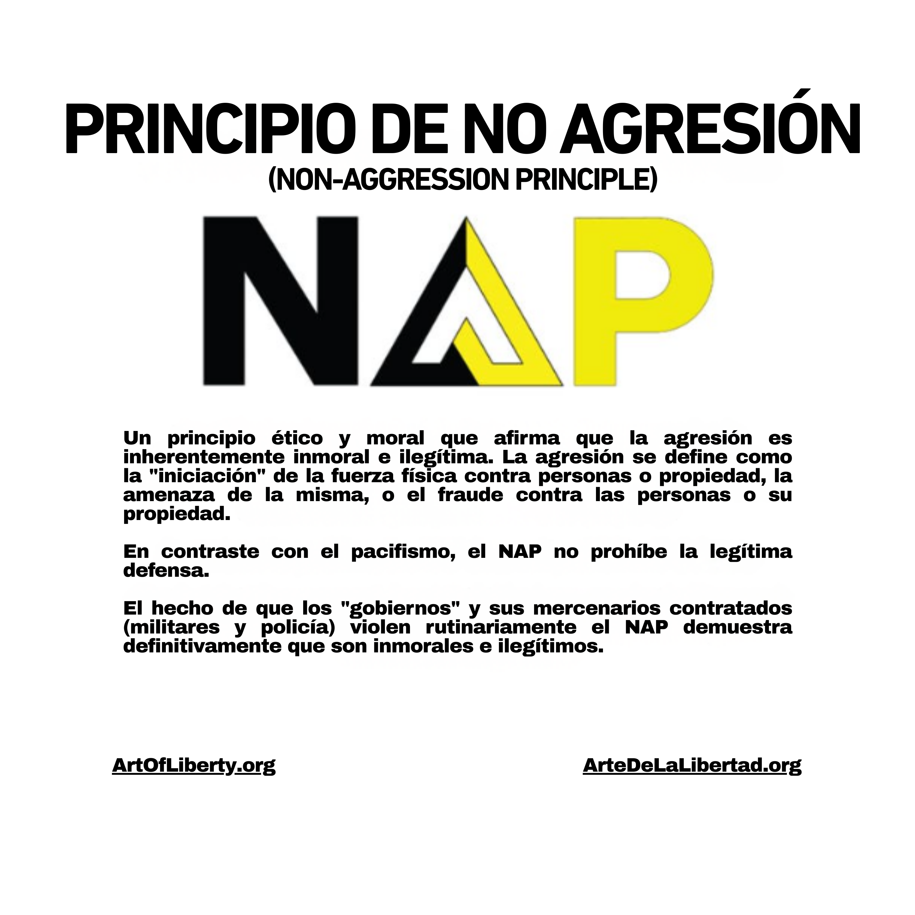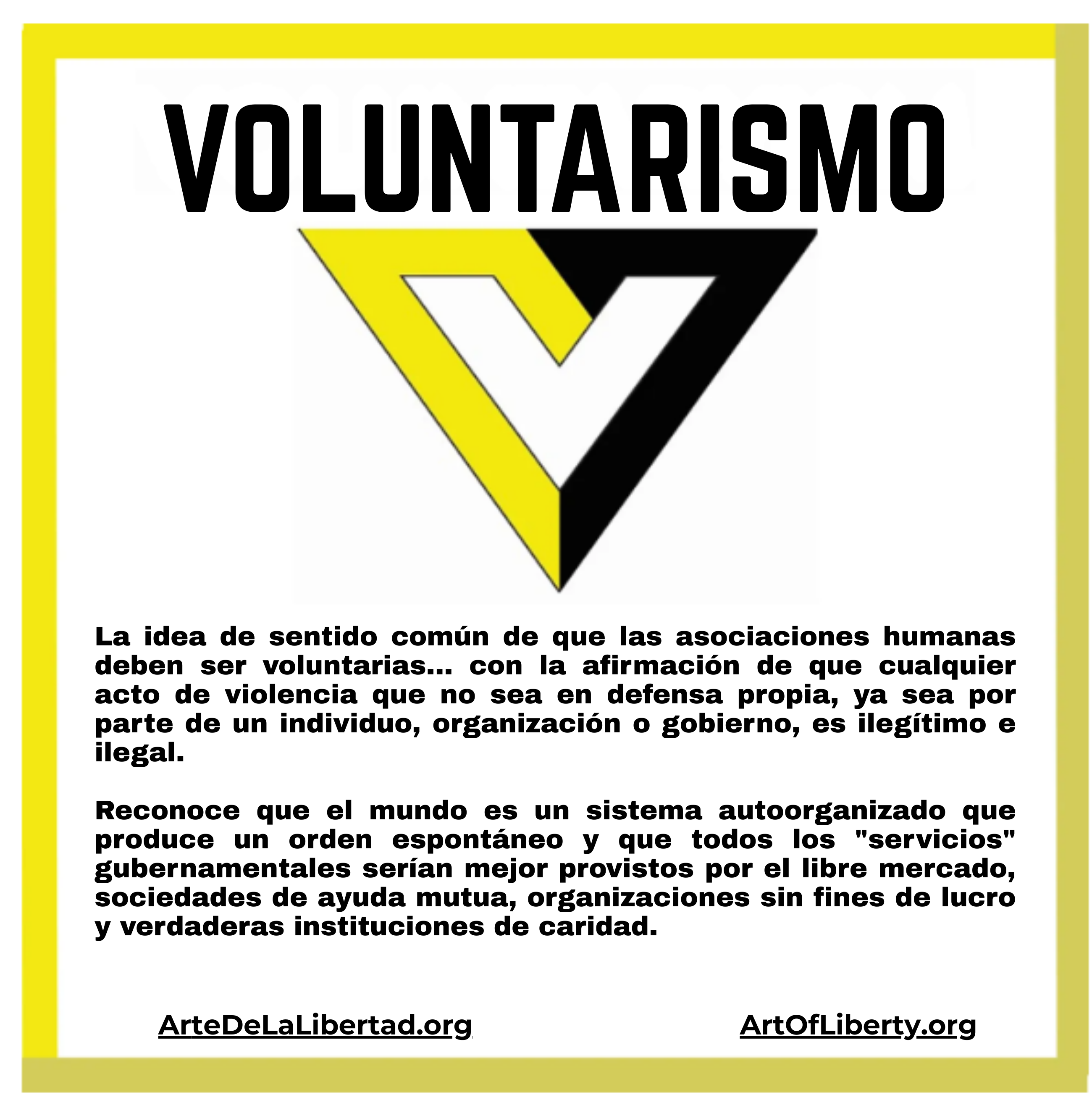 Otro principio fundamental del voluntarismo es el Principio de No Agresión (PNA), que es esencialmente una codificación de la “Regla de Oro” de “Trata a los demás como te gustaría que te trataran a ti”. Se trata de un principio ético y moral que afirma que la agresión, la amenaza de agresión o el fraude a las personas o a sus bienes son inherentemente inmorales e ilegítimos.