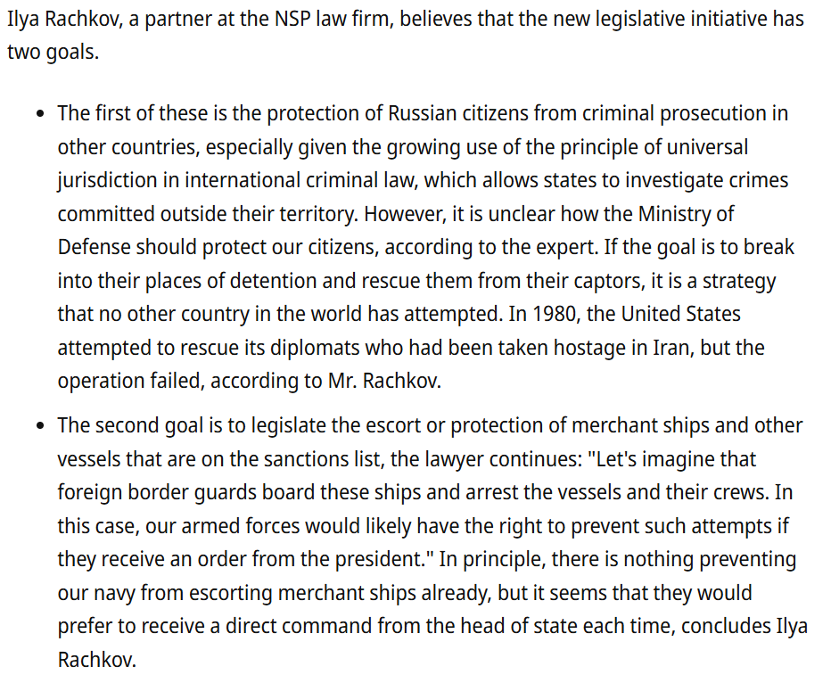 On March 10, the Government Commission on Legislative Activities approved a draft law developed by the Ministry of Defense on the use of the Russian Armed Forces to protect Russian citizens who have been persecuted by foreign or international courts. Experts believe that this may be a legislative framework for the protection of merchant ships, but Russian naval forces do not have sufficient resources for regular convoys.