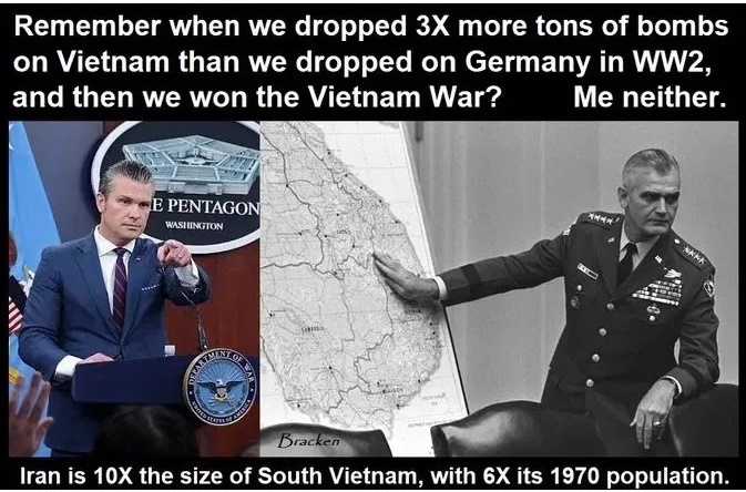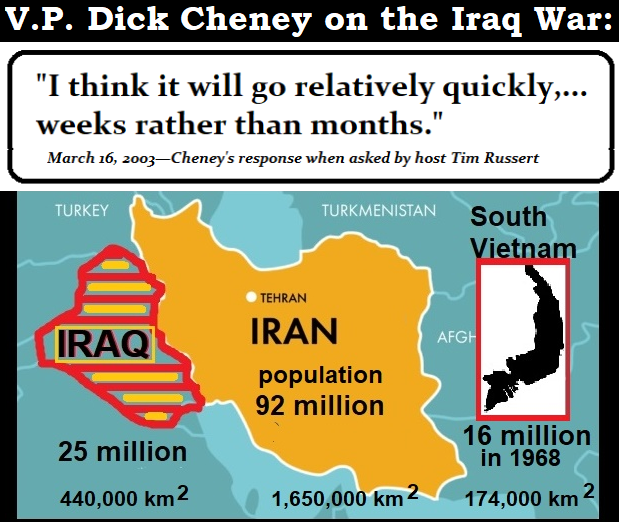Iran is 10X bigger than South Vietnam, with 6X it’s 1968 population. And we’ll have to fight through missiles just to approach and gain a beachhead on Iranian territory.