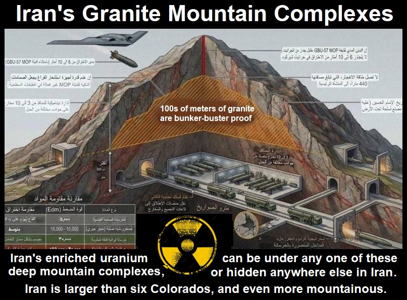 Or maybe we’ll try some daring land raids, to find Iran’s enriched uranium. Keep in mind the “down pilot rescue” took place relatively close to Kuwait. Iran is six times bigger than Colorado, and even more mountainous. And the uranium may be split up and hidden in mountain fortresses like these, that are impervious to our “bunker busters.”
