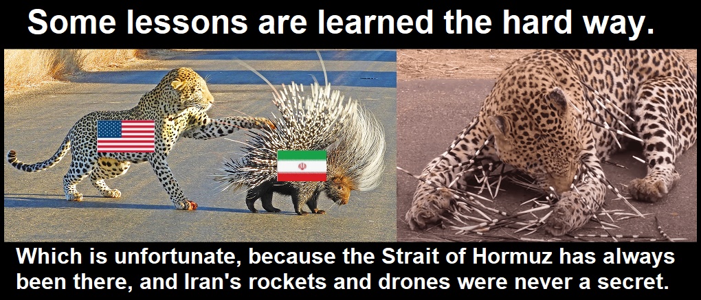For the record, I am not pro-woodchipper, or pro-porcupine, or pro-Iran. I am trying to keep the potentially coming Great Energy World War sea battles in the realm of reality, and not a recurring fantasy of our Navy’s glory days of WW2.