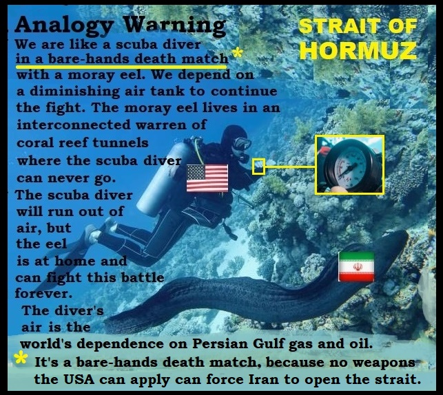 Iran can wait us out, we can’t wait out a global great depression. We are like the scuba diver with a limited air supply, Iran is the moray eel, playing on his home terrain.