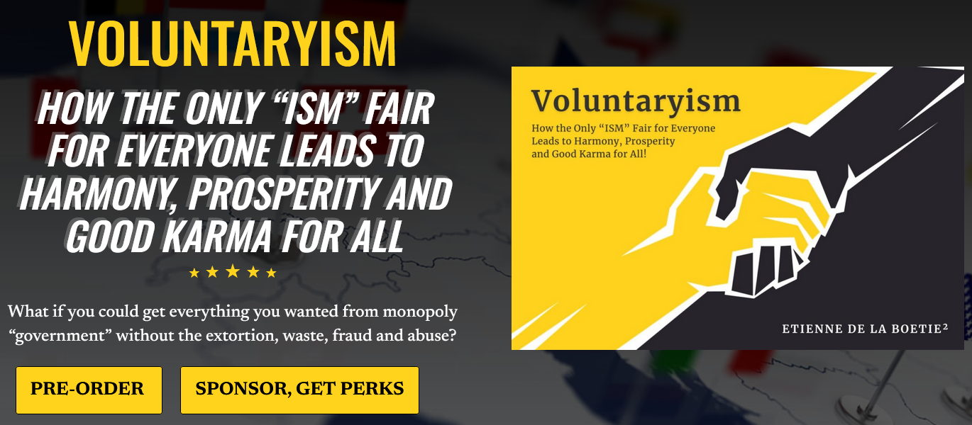 We are trying to raise the final ~$18,000 to finish our upcoming book: Voluntaryism - How the Only “ISM” Fair for Everyone Leads to Harmony, Prosperity and Good Karma for All! We have raised over $6,000 from 80+ supporters but need to raise an additional $18,000. Click HERE if you would like to help… We have some great perks to say: Thank You!!