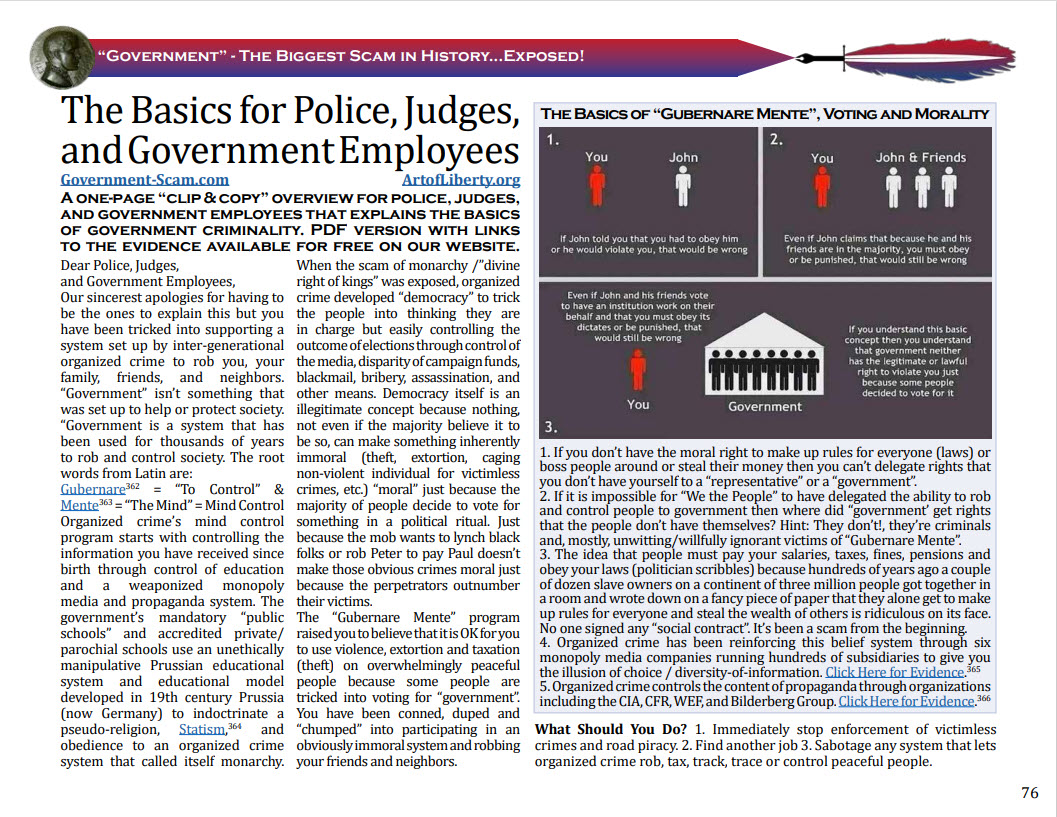 WARNING - For many, especially those who work for the “government,” police or serve/served in the military, what you are going to learn in this article is going to be painful. If you read with an open mind and you are able to take a step back and analyze what you were told as a child about the legitimacy, desirability, necessity and morality of “Government,” you are going to discover that you were tricked… By mandatory schools, scouting and a multi-trillion dollar control-of-perception program of monopoly media and algorithmic censorship on the DARPA Internet... Just like this author was for decades… into supporting a system based on lies, propaganda, indoctrination, extortion and violence. The reward comes in knowing the truth because the truth shall, quite literally, set you free. - To admit that one was wrong is to declare that you are wiser now than you were before.