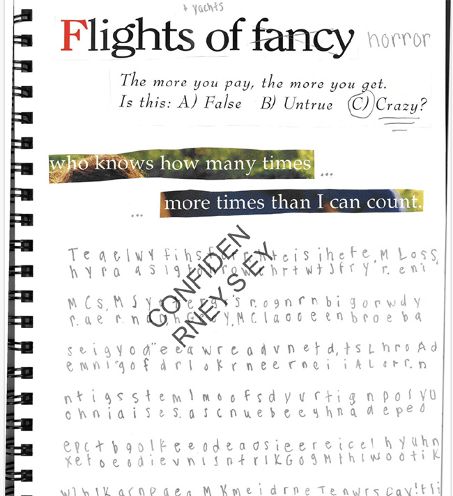 In the page above, the girl turned the magazine headline “Flight of fancy” into “Flights (+ yachts) of horror.” Underneath is a coded message (to be read vertically, two lines at a time) describing these flights of horror. Here’s what this page says: