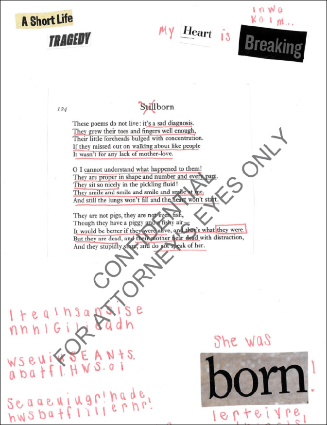 On the page is glued a poem titled Stillborn. The girl drew an X through the word “Still” because her baby had been born.