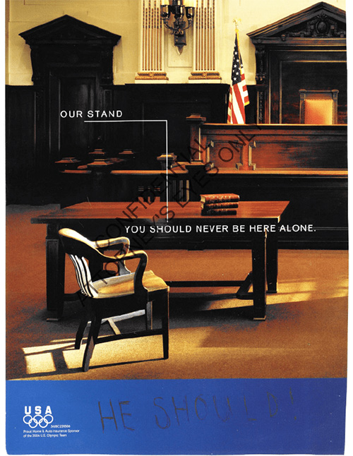 On one page, the girl glued an Allstate Insurance ad that depicts a courtroom with the words “Our stand. You should never be here alone.” Underneath the photo, the girl wrote, “He should!”