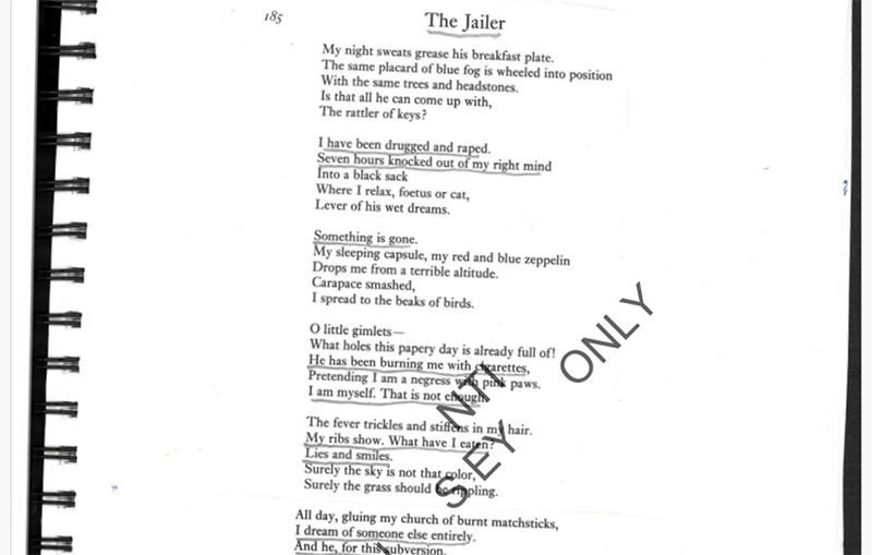 On other pages are glued poems by Sylvia Plath (who infamously took her own life in 1963). In each case, the girl underlined the passages that particularly applied to her, such as “I have been drugged and raped. Seven hours knocked right out of my mind.”