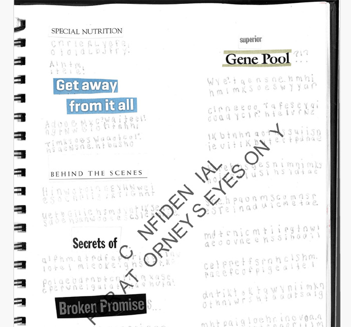 The journals are made of words and phrases cut out from magazines, combined with handwritten additions of her own.