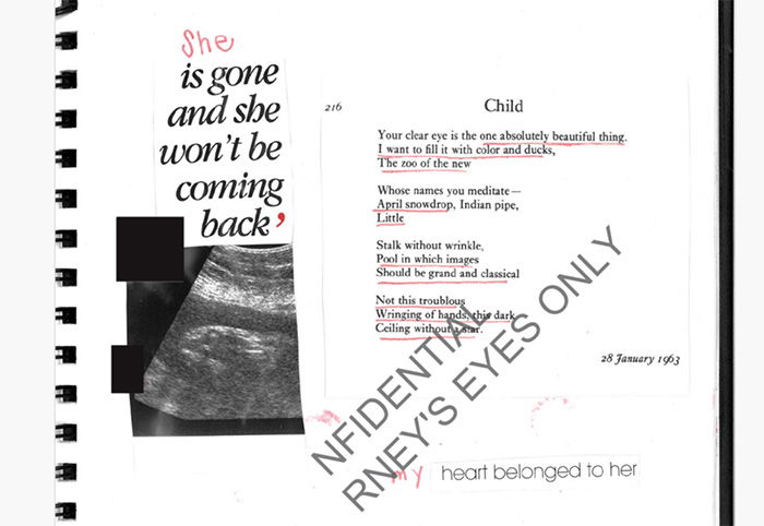 Several journal pages contain baby sonograms along with disturbing words, poems, and coded messages.