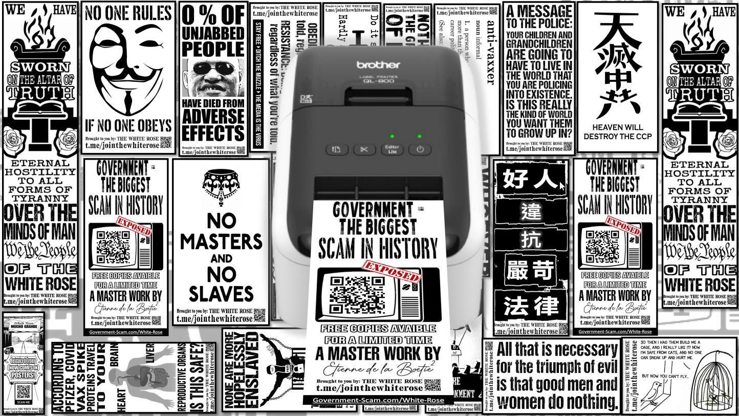 Individual White Rose members around the world then download and print the stickers on inexpensive Brother QR 800 label printers, where they are then distributed to other liberty activists who then stick them in high-traffic locations to get around the monopolization and censorship of the media.