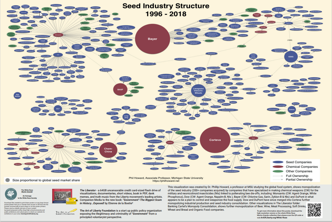 · A monopolization of seed companies (200+ companies acquired) by companies that started out making chemical weapons for the military (Monsanto, Bayer, Dow and DuPont) that now make genetically modified crops/seeds, including “Terminator Seeds” engineered NOT to produce viable seeds when harvested AND GMO seeds linked to harmful health outcomes (Séralini Paper).