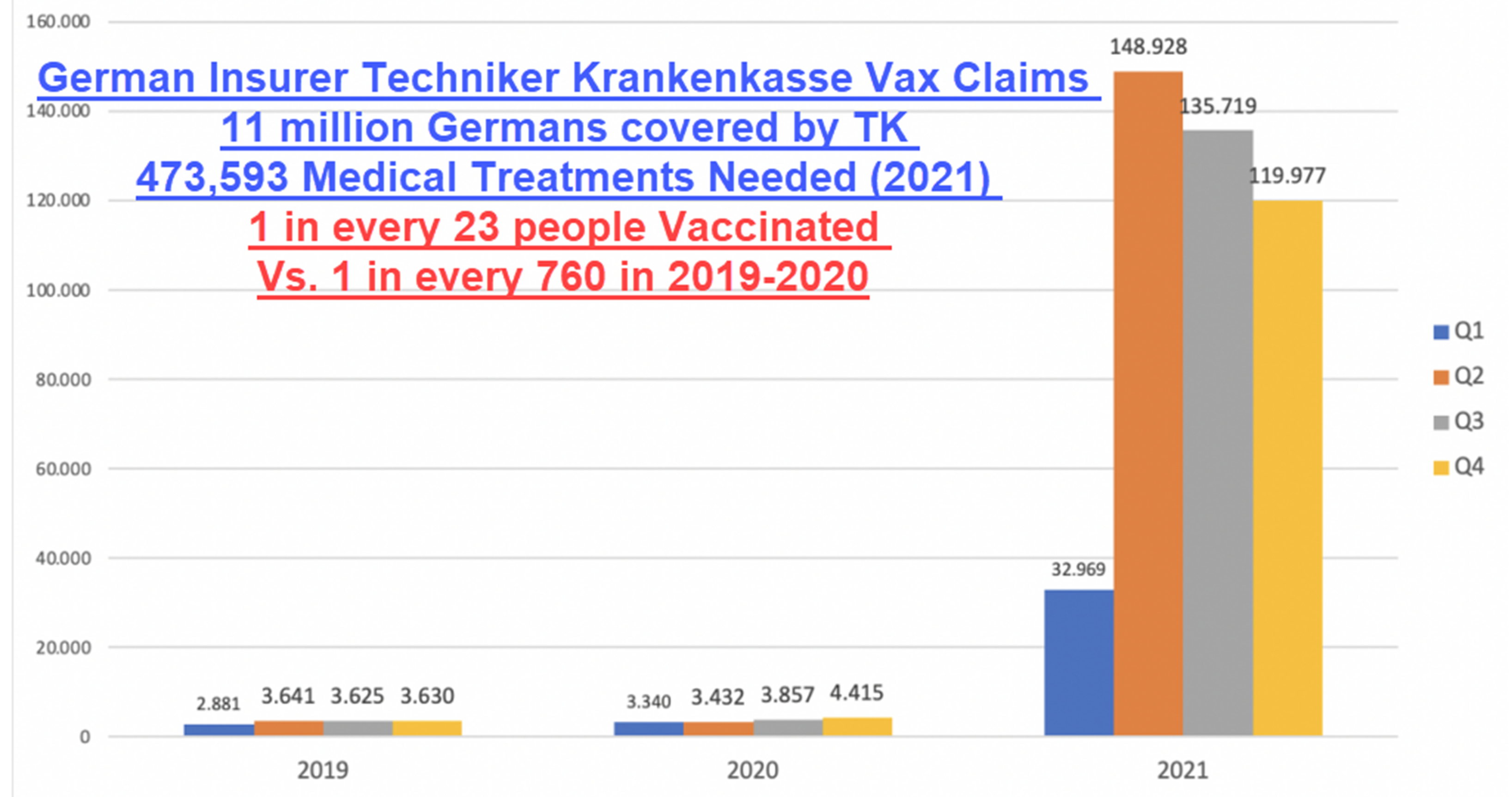 According to a response to an official request for information from the German Techniker Krankenkasse insurer, the number of billed cases of vaccine-related adverse effects needing medical treatment skyrocketed in 2021 compared with 2019 and 2020. The request relates to four diagnostic codes: T.88.0: Infection following immunization, T.88.1: Other complications after immunization, U.12.9: Adverse effects after Covid-19 immunization, Y.59.9: Complications due to vaccines or biological substances.