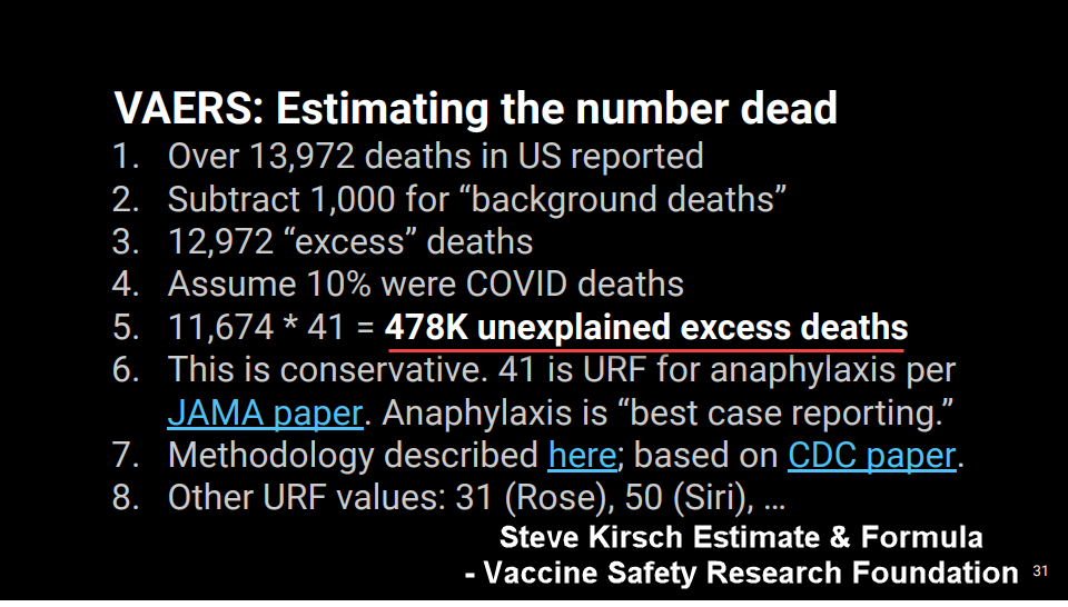 Even multiplying by a conservative Under Reporting Factor (URF) of 40 indicates 20 million dead globally from the “vaccines” and around 2 billion injured. The Lazarus Study by the Harvard School of Public Health for the Harvard Pilgrim Health System estimated that less than 1% of adverse effects were reported to the US VAERS system I.E. URF =100. We use 40, Aaron Siri uses 50, VAERSAnalysis.info uses 44.6, and Steve Kirsch of the Vaccine Safety Research Foundation uses 41. See below for his complete calculation.