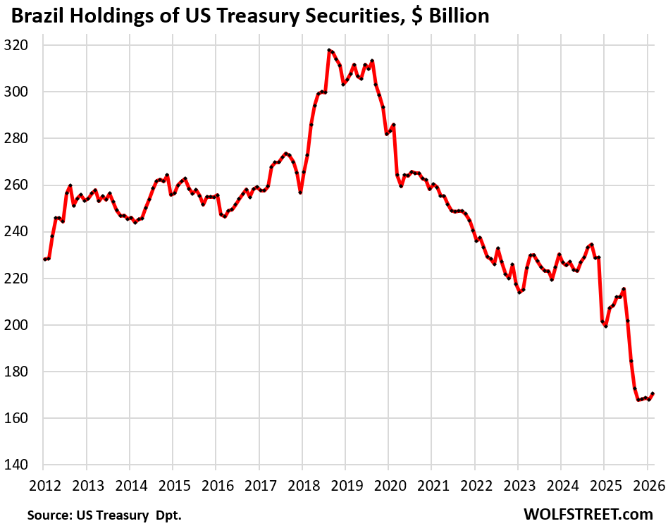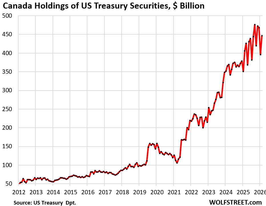 Canada’s holdings have been gyrating up and down in massive spikes and plunges in all of 2025, and that continued into 2026. In February, they jumped by $50 billion, after the plunge in the prior month, to $446 billion.