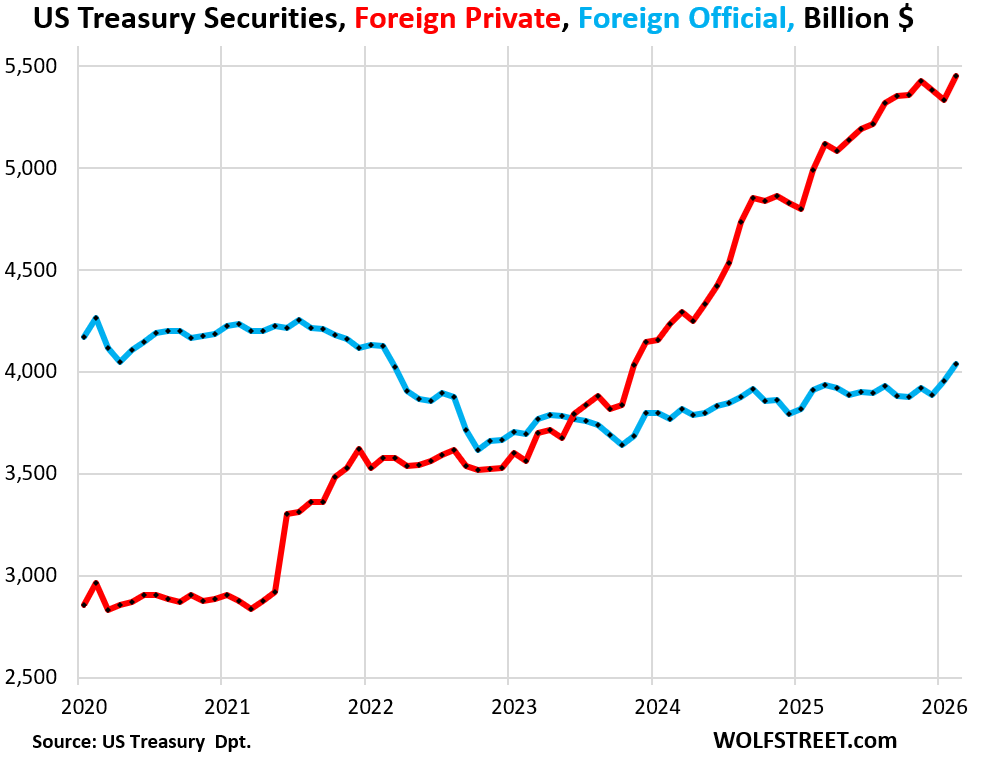 These private foreign investors include financial firms in other countries, foreign bond funds, foreign companies, individuals in foreign countries, but also US hedge funds domiciled in the Cayman Islands, such as those engaged in the “Basis Trade,” and Corporate America with financial entities in Ireland, such as to legally dodge US taxes.