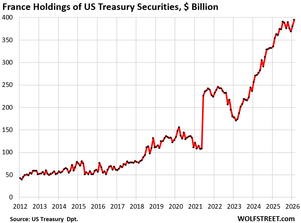 France’s holdings rose by $15 billion in February, and by $41 billion in the 12-month period, to a record $395 billion.