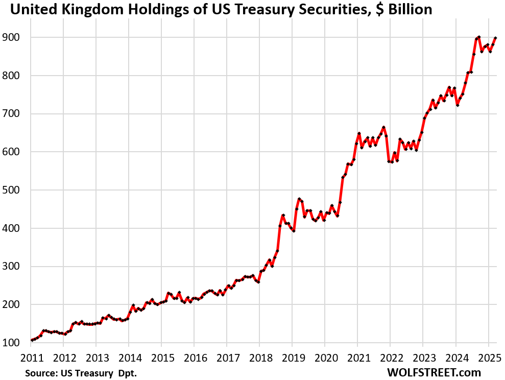 The United Kingdom is the “City of London” financial center. Its Treasury holdings rose by $18 billion in February and by $147 billion in the 12-month period, to $897 billion. The record was in August 2025 at $901 billion.