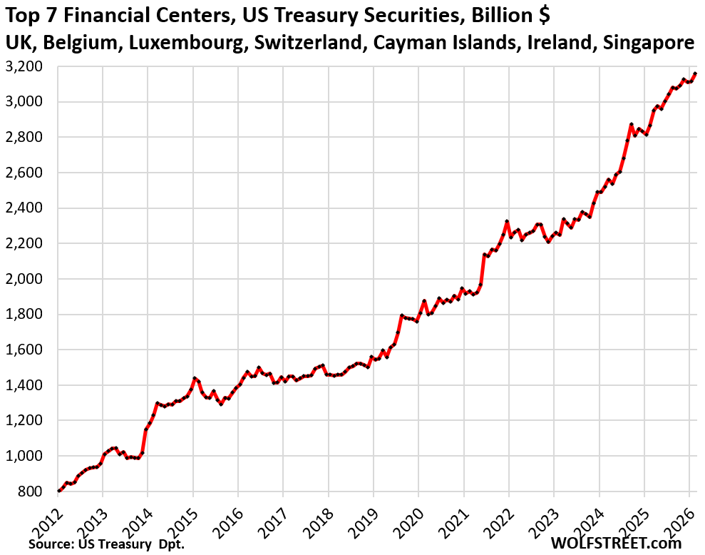 The seven largest financial centers piled on another $44 billion in February and $295 billion over the 12-month period, bringing their total holdings to a record $3.16 trillion. They more than doubled their Treasury holdings over the past 10 years.