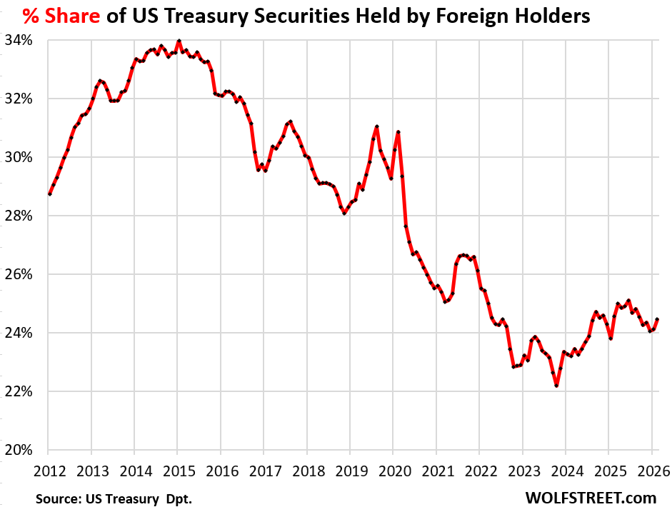 The share of total Treasury securities held by foreign entities had peaked at 34% in 2015, then fell to a low of 22% in October 2023, and has been marching higher since then.