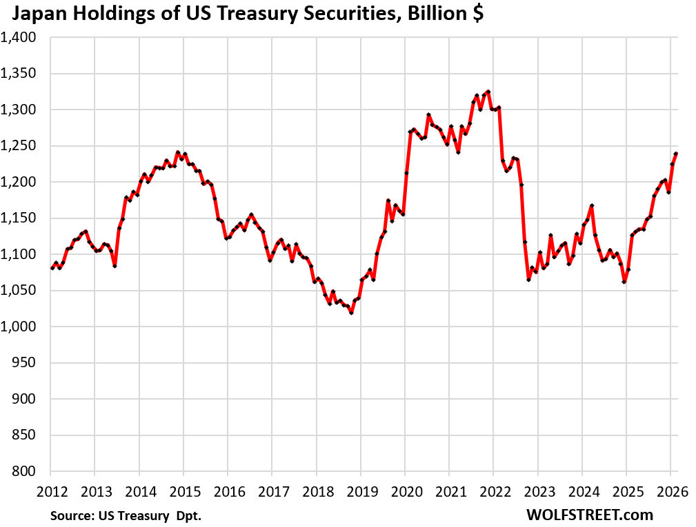 Japan’s holdings of Treasury securities rose by $14 billion in February, and by $113 billion over the 12-month period, to $1.24 trillion.